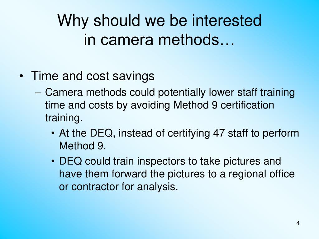 Why should we be interested in camera methods… • Time and cost savings • Camera methods could potentially lower staff training time and costs by avoiding Method 9 certification training. • At the DEQ, instead of certifying 47 staff to perform Method 9. • DEQ could train inspectors to take pictures and have them forward the pictures to a regional office or contractor for analysis.