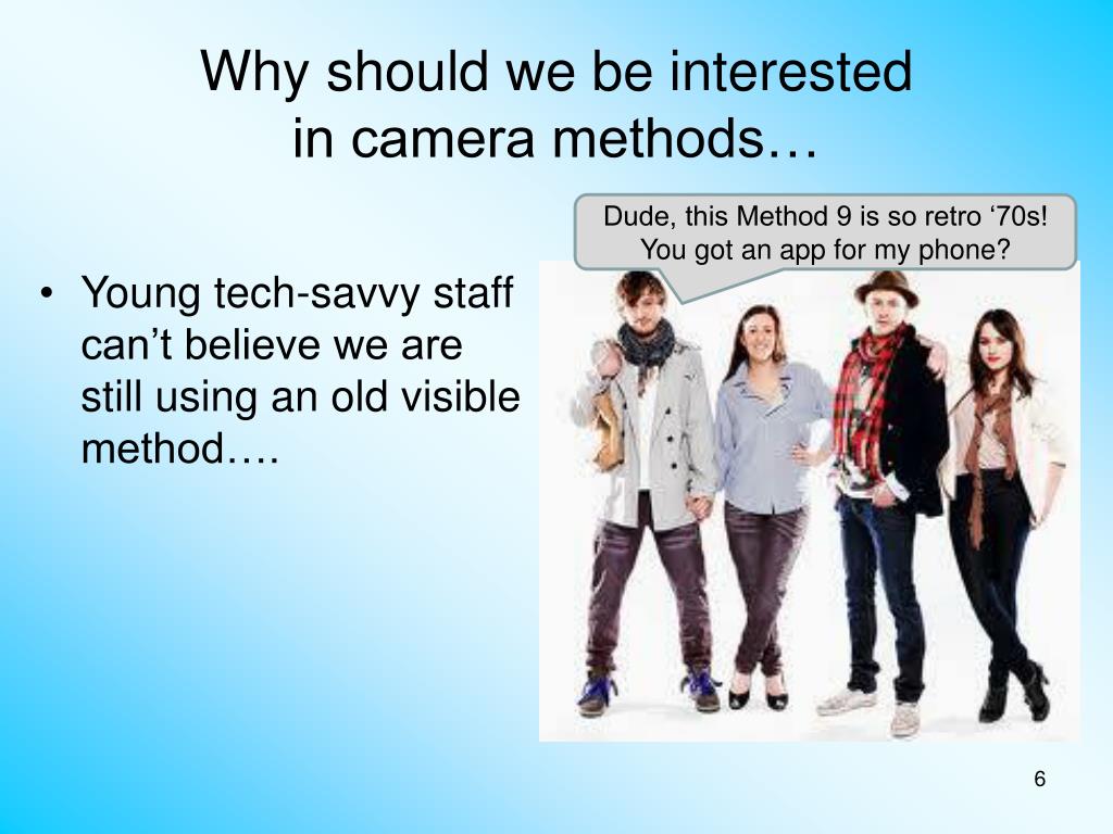 Why should we be interested in camera methods… Dude, this Method 9 is so retro ‘70s! You got an app for my phone? • Young tech-savvy staff can’t believe we are still using an old visible method….