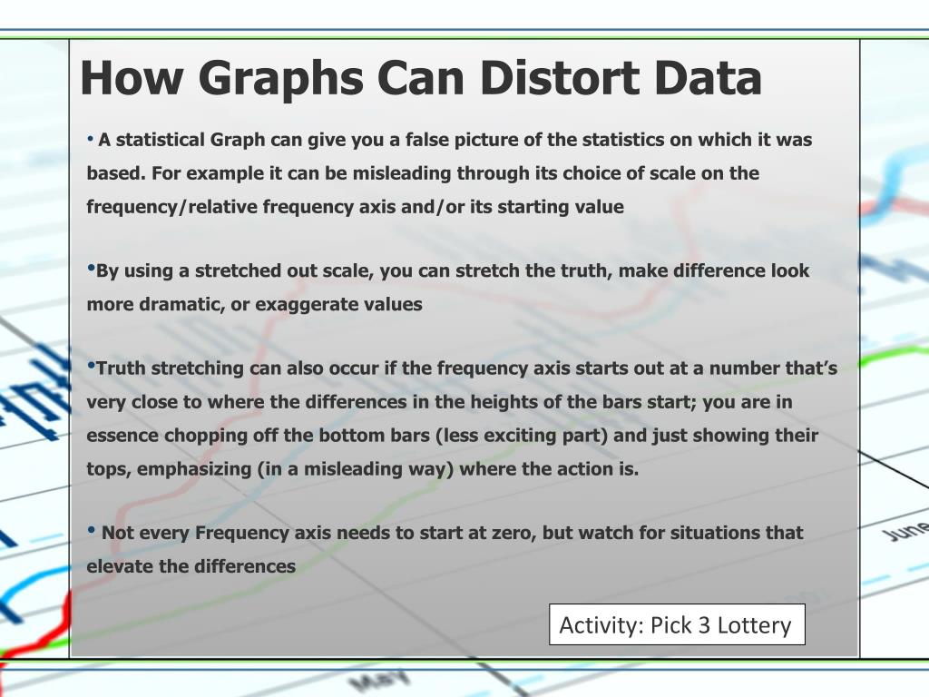 How Graphs Can Distort Data A statistical Graph can give you a false picture of the statistics on which it was based. For example it can be misleading through its choice of scale on the frequency/relative frequency axis and/or its starting value By using a stretched out scale, you can stretch the truth, make difference look more dramatic, or exaggerate values Truth stretching can also occur if the frequency axis starts out at a number that’s very close to where the differences in the heights of the bars start; you are in essence chopping off the bottom bars (less exciting part) and just showing their tops, emphasizing (in a misleading way) where the action is. Not every Frequency axis needs to start at zero, but watch for situations that elevate the differences Activity: Pick 3 Lottery