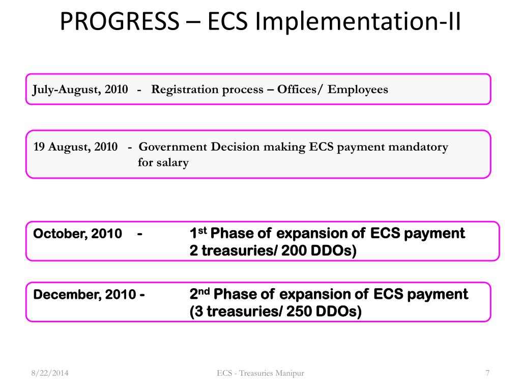PROGRESS – ECS Implementation-II July-August, 2010 - Registration process – Offices/ Employees 19 August, 2010 - Government Decision making ECS payment mandatory for salary October, 2010 - 1st Phase of expansion of ECS payment 2 treasuries/ 200 DDOs) December, 2010 - 2nd Phase of expansion of ECS payment (3 treasuries/ 250 DDOs) ECS - Treasuries Manipur