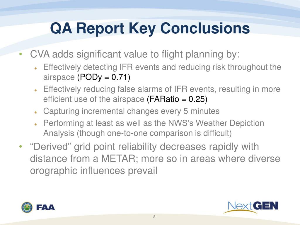 QA Report Key Conclusions • CVA adds significant value to flight planning by: • Effectively detecting IFR events and reducing risk throughout the airspace (PODy = 0.71) • Effectively reducing false alarms of IFR events, resulting in more efficient use of the airspace (FARatio = 0.25) • Capturing incremental changes every 5 minutes • Performing at least as well as the NWS’s Weather Depiction Analysis (though one-to-one comparison is difficult) • “Derived” grid point reliability decreases rapidly with distance from a METAR; more so in areas where diverse orographic influences prevail