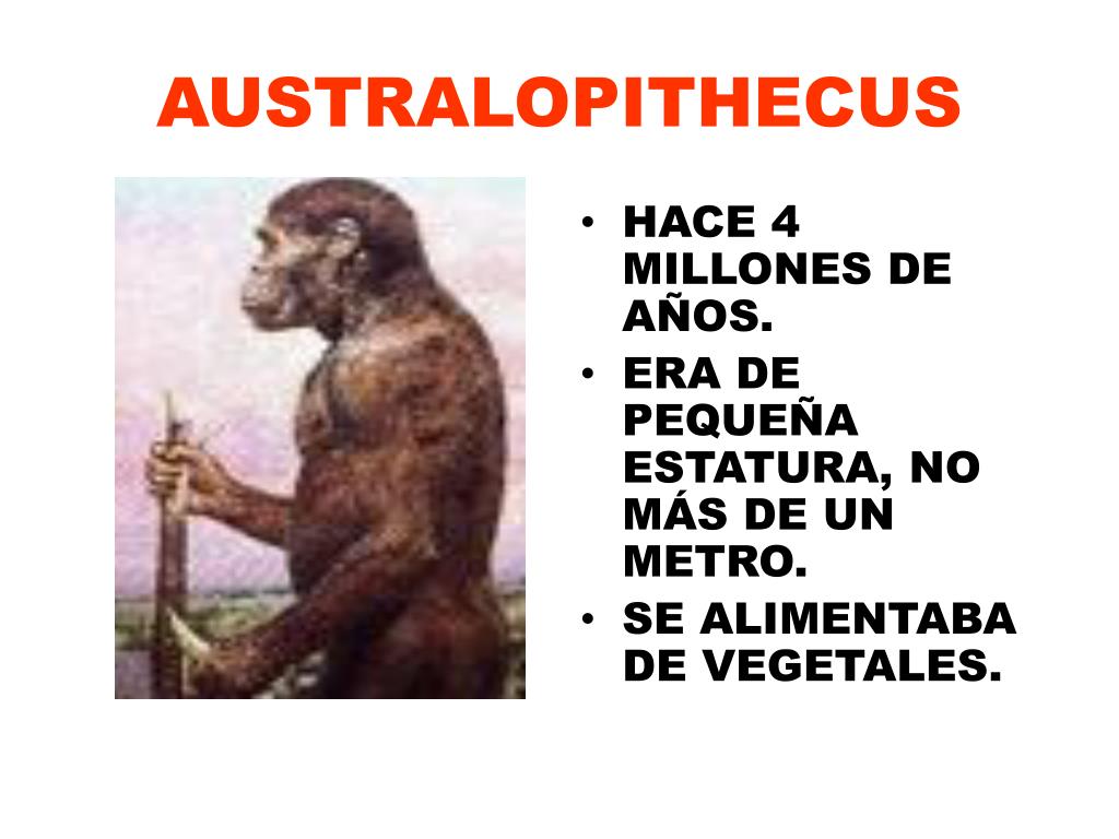 AUSTRALOPITHECUS • HACE 4 MILLONES DE AÑOS. • ERA DE PEQUEÑA ESTATURA, NO MÁS DE UN METRO. • SE ALIMENTABA DE VEGETALES.