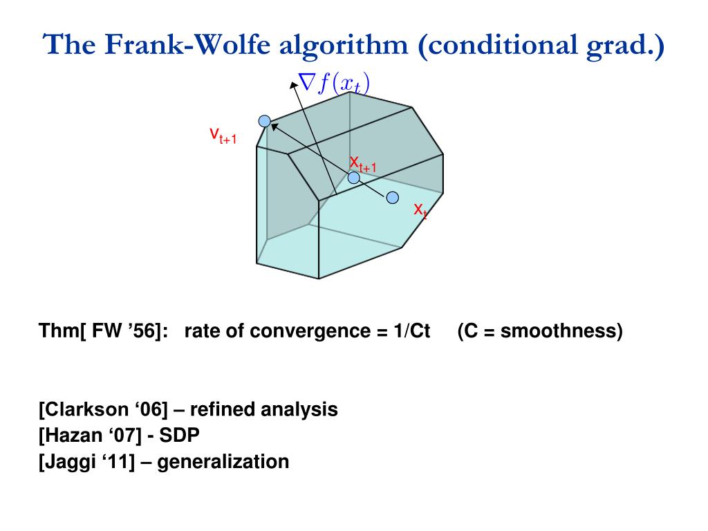 The Frank-Wolfe algorithm (conditional grad.) Thm[ FW ’56]: rate of convergence = 1/Ct (C = smoothness) [Clarkson ‘06] – refined analysis [Hazan ‘07] - SDP [Jaggi ‘11] – generalization vt+1 xt+1 xt