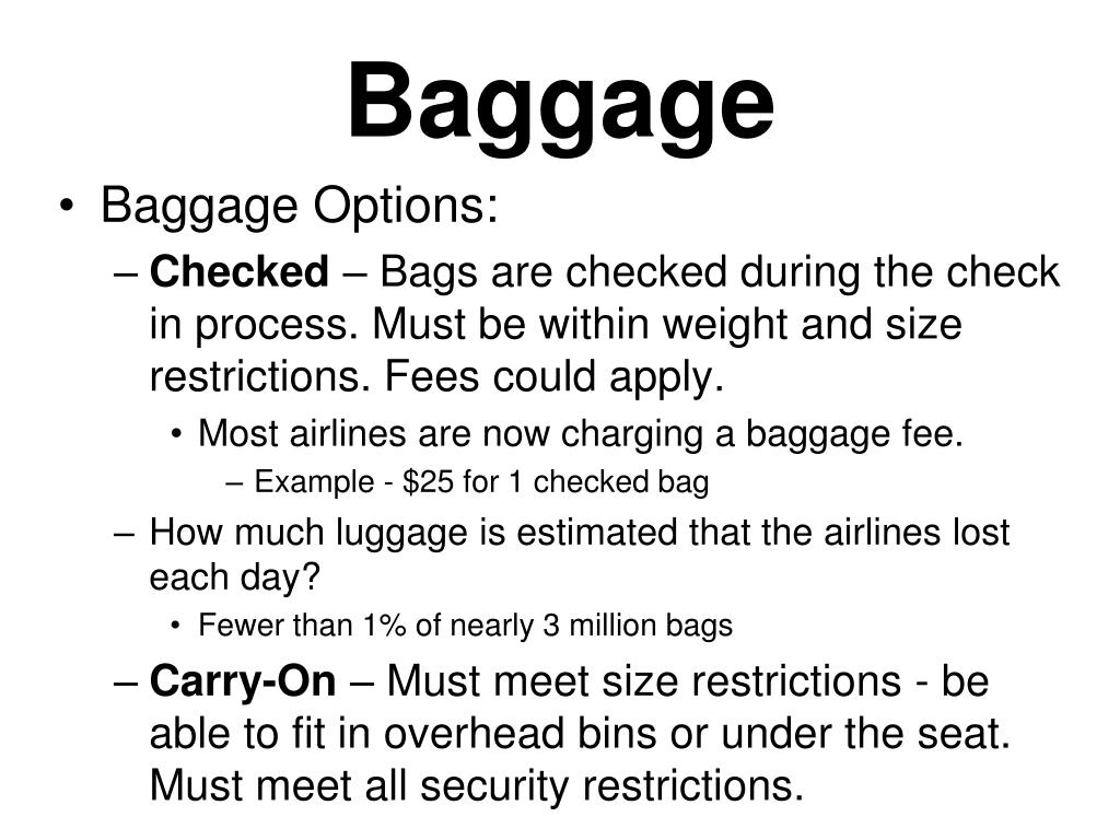 Baggage • Baggage Options: • Checked – Bags are checked during the check in process. Must be within weight and size restrictions. Fees could apply. • Most airlines are now charging a baggage fee. • Example - $25 for 1 checked bag • How much luggage is estimated that the airlines lost each day? • Fewer than 1% of nearly 3 million bags • Carry-On – Must meet size restrictions - be able to fit in overhead bins or under the seat. Must meet all security restrictions.