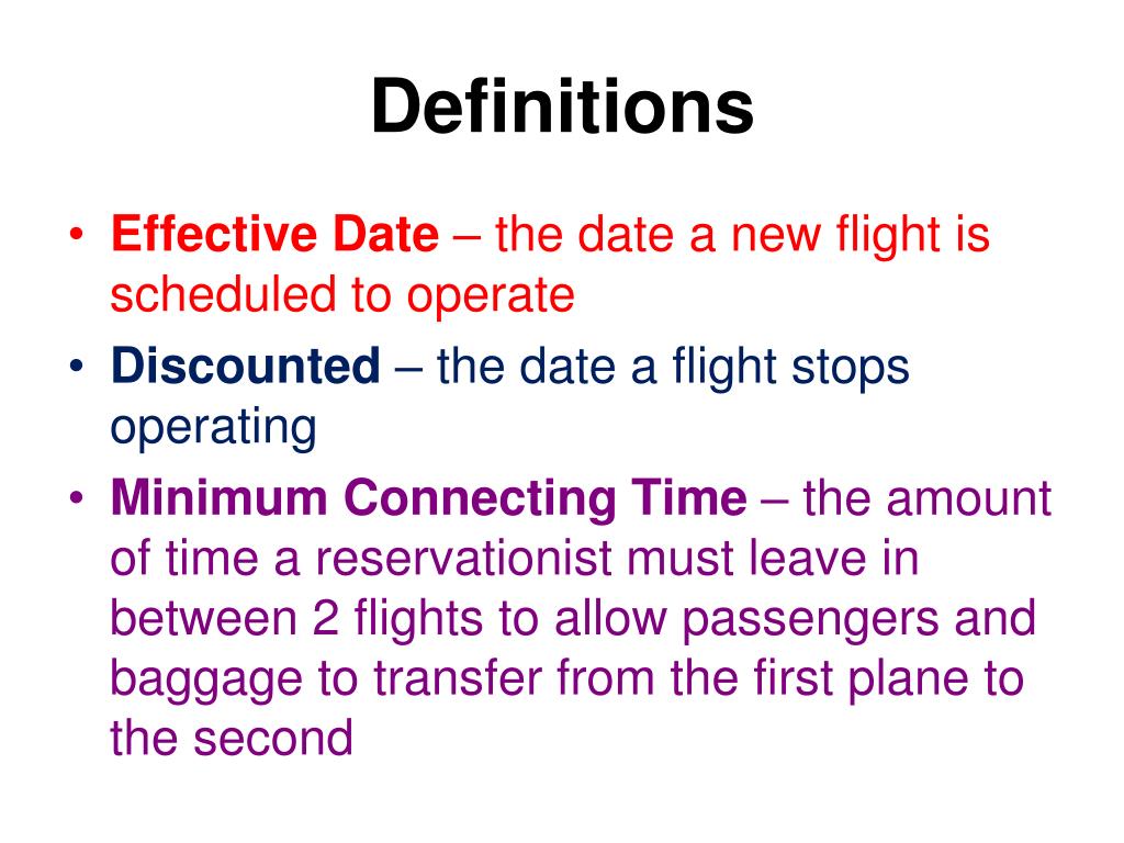 Definitions • Effective Date – the date a new flight is scheduled to operate • Discounted – the date a flight stops operating • Minimum Connecting Time – the amount of time a reservationist must leave in between 2 flights to allow passengers and baggage to transfer from the first plane to the second
