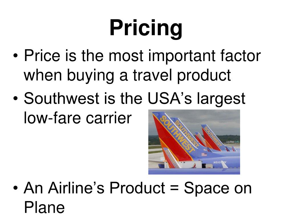 Pricing • Price is the most important factor when buying a travel product • Southwest is the USA’s largest low-fare carrier • An Airline’s Product = Space on Plane