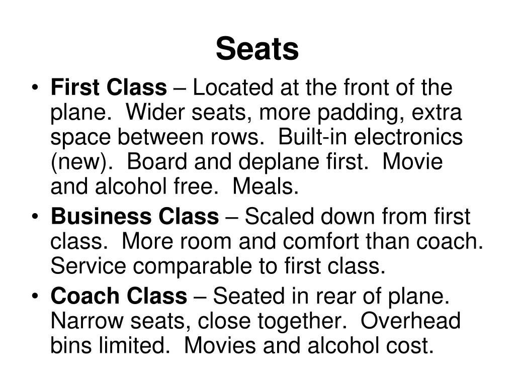 Seats • First Class – Located at the front of the plane. Wider seats, more padding, extra space between rows. Built-in electronics (new). Board and deplane first. Movie and alcohol free. Meals. • Business Class – Scaled down from first class. More room and comfort than coach. Service comparable to first class. • Coach Class – Seated in rear of plane. Narrow seats, close together. Overhead bins limited. Movies and alcohol cost.