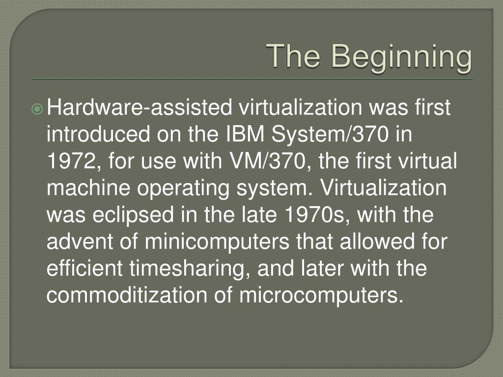 The Beginning Hardware-assisted virtualization was first introduced on the IBM System/370 in 1972, for use with VM/370, the first virtual machine operating system. Virtualization was eclipsed in the late 1970s, with the advent of minicomputers that allowed for efficient timesharing, and later with the commoditization of microcomputers.
