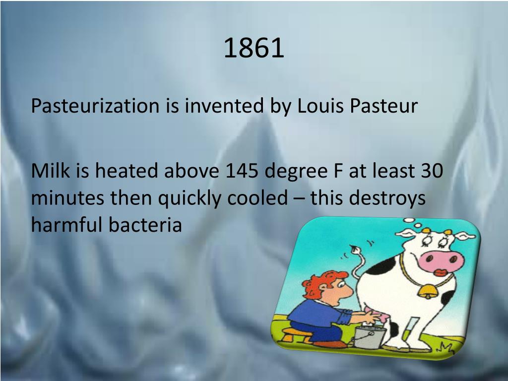 1861 Pasteurization is invented by Louis Pasteur Milk is heated above 145 degree F at least 30 minutes then quickly cooled – this destroys harmful bacteria