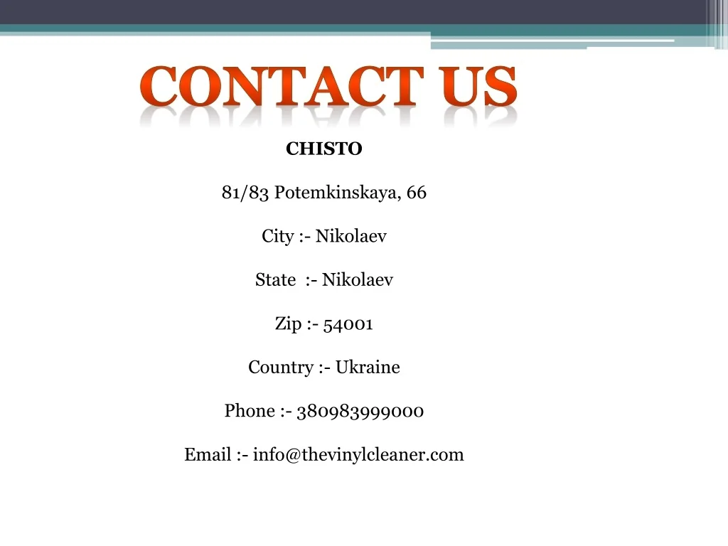 Contact Us CHISTO 81/83 Potemkinskaya, 66 City :- Nikolaev State :- Nikolaev Zip :- 54001 Country :- Ukraine Phone :- 380983999000 Email :- info@thevinylcleaner.com