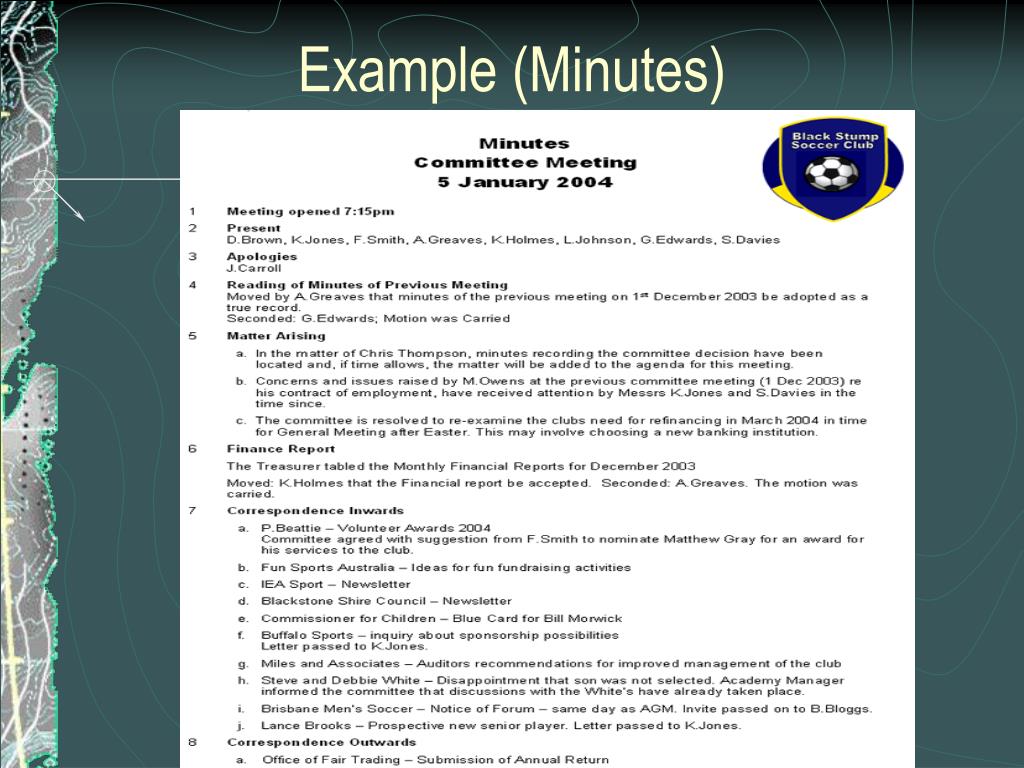 Workplace Documents • minutes a written report of a particular action in an organization, such as a meeting. The previous meeting's minutes are usually reviewed at the beginning of the following meeting.