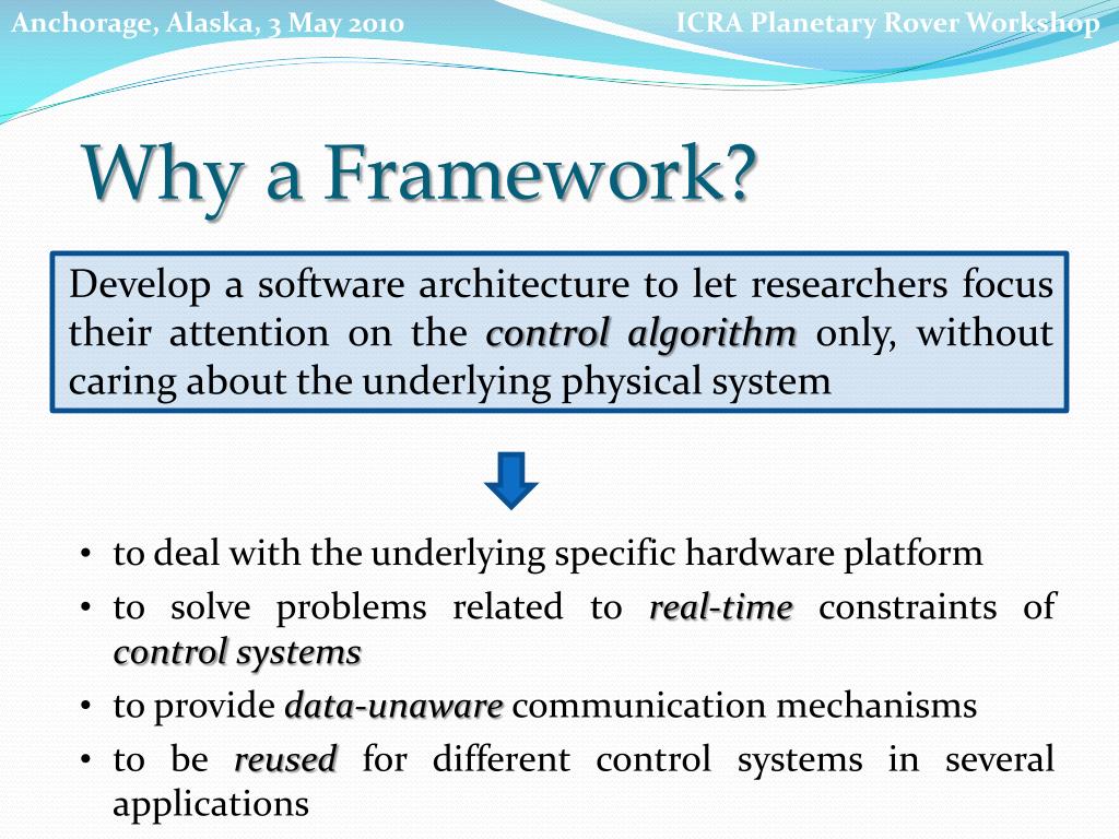 Anchorage, Alaska, 3 May 2010 ICRA Planetary Rover Workshop Why a Framework? • to deal with the underlyingspecific hardware platform • to solve problemsrelatedtoreal-timeconstraintsofcontrolsystems • toprovidedata-unawarecommunicationmechanisms • tobereusedfordifferentcontrolsystems in severalapplications Develop a software architecturetoletresearchers focus theirattention on the controlalgorithmonly, withoutcaringabout the underlyingphysical system