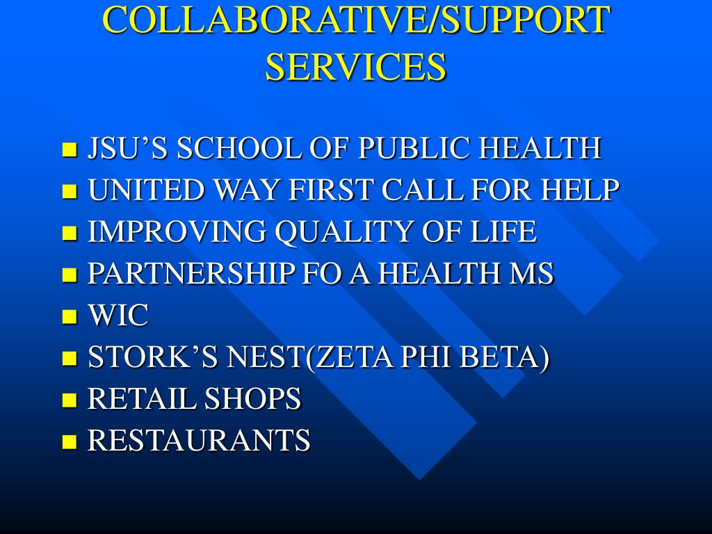 COLLABORATIVE/SUPPORT SERVICES • JSU’S SCHOOL OF PUBLIC HEALTH • UNITED WAY FIRST CALL FOR HELP • IMPROVING QUALITY OF LIFE • PARTNERSHIP FO A HEALTH MS • WIC • STORK’S NEST(ZETA PHI BETA) • RETAIL SHOPS • RESTAURANTS