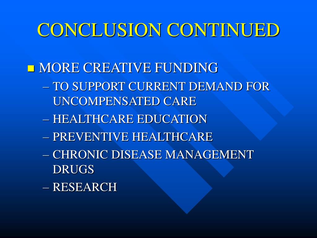 CONCLUSION CONTINUED • MORE CREATIVE FUNDING • TO SUPPORT CURRENT DEMAND FOR UNCOMPENSATED CARE • HEALTHCARE EDUCATION • PREVENTIVE HEALTHCARE • CHRONIC DISEASE MANAGEMENT DRUGS • RESEARCH