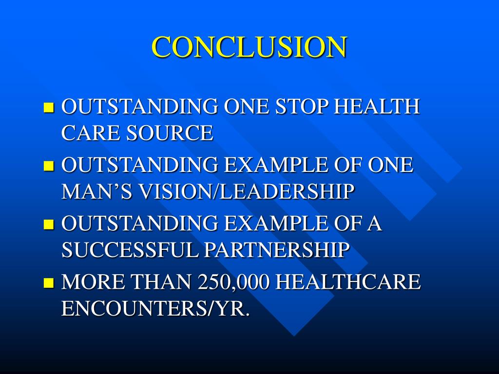 CONCLUSION • OUTSTANDING ONE STOP HEALTH CARE SOURCE • OUTSTANDING EXAMPLE OF ONE MAN’S VISION/LEADERSHIP • OUTSTANDING EXAMPLE OF A SUCCESSFUL PARTNERSHIP • MORE THAN 250,000 HEALTHCARE ENCOUNTERS/YR.