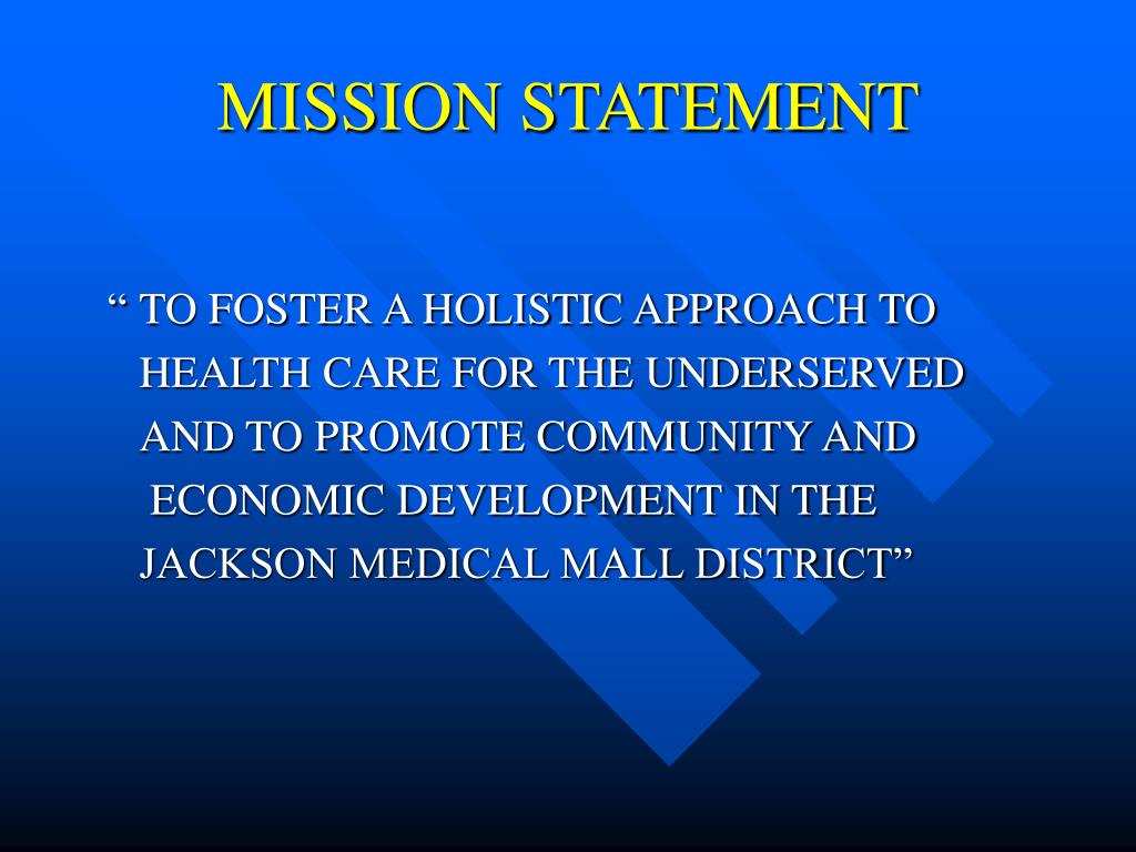 MISSION STATEMENT “ TO FOSTER A HOLISTIC APPROACH TO HEALTH CARE FOR THE UNDERSERVED AND TO PROMOTE COMMUNITY AND ECONOMIC DEVELOPMENT IN THE JACKSON MEDICAL MALL DISTRICT”
