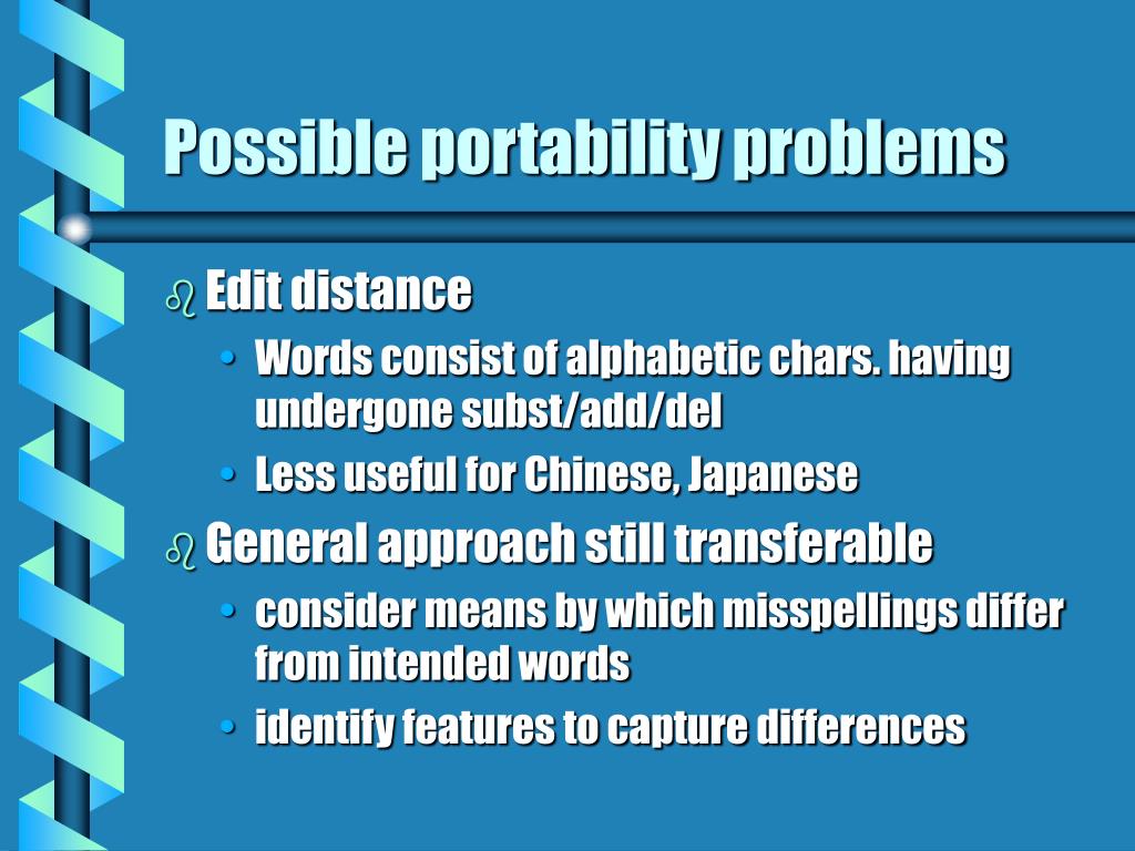 Possible portability problems • Edit distance • Words consist of alphabetic chars. having undergone subst/add/del • Less useful for Chinese, Japanese • General approach still transferable • consider means by which misspellings differ from intended words • identify features to capture differences