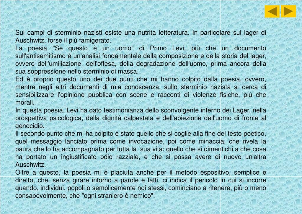 Sui campi di sterminio nazisti esiste una nutrita letteratura. In particolare sul lager di Auschwitz, forse il più famigerato. La poesia "Se questo è un uomo" di Primo Levi, più che un documento sull'antisemitismo è un'analisi fondamentale della composizione e della storia del lager, ovvero dell'umiliazione, dell'offesa, della degradazione dell'uomo, prima ancora della sua soppressione nello sterminio di massa. Ed è proprio questo uno dei due punti che mi hanno colpito dalla poesia, ovvero, mentre negli altri documenti di mia conoscenza, sullo sterminio nazista si cerca di sensibilizzare l'opinione pubblica con scene e racconti di violenze fisiche, più che morali. In questa poesia, Levi ha dato testimonianza dello sconvolgente inferno dei Lager, nella prospettiva psicologica, della dignità calpestata e dell'abiezione dell'uomo di fronte al genocidio. Il secondo punto che mi ha colpito è stato quello che si coglie alla fine del testo poetico, quel messaggio lanciato prima come invocazione, poi come minaccia, che rivela la paura che lo ha accompagnato per tutta la sua vita: quello che si dimentichi a che cosa ha portato un ingiustificato odio razziale, e che si possa avere di nuovo un'altra Auschwitz. Oltre a questo, la poesia mi è piaciuta anche per il metodo espositivo, semplice e diretto, che, senza girare intorno a parole e fatti, ci indica il pericolo in cui si incorre quando, individui, popoli o semplicemente noi stessi, cominciano a ritenere, più o meno consapevolmente, che "ogni straniero è nemico".