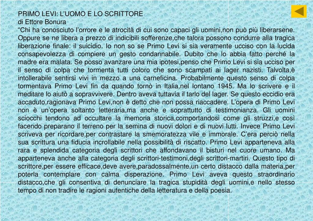 PRIMO LEVI: L’UOMO E LO SCRITTORE di Ettore Bonura “Chi ha conosciuto l’orrore e le atrocità di cui sono capaci gli uomini,non può più liberarsene. Oppure se ne libera a prezzo di indicibili sofferenze,che talora possono condurre alla tragica liberazione finale: il suicidio. Io non so se Primo Levi si sia veramente ucciso con la lucida consapevolezza di compiere un gesto condannabile. Dubito che lo abbia fatto perché la madre era malata. Se posso avanzare una mia ipotesi,penso che Primo Levi si sia ucciso per il senso di colpa che tormenta tutti coloro che sono scampati ai lager nazisti. Talvolta,è intollerabile sentirsi vivi in mezzo a una carneficina. Probabilmente questo senso di colpa tormentava Primo Levi fin da quando tornò in Italia,nel lontano 1945. Ma lo scrivere e il meditare lo aiutò a sopravvivere. Dentro aveva tuttavia il tarlo del lager. Se questo eccidio era accaduto,ragionava Primo Levi,non è detto che non possa riaccadere. L’opera di Primo Levi non è un’opera soltanto letteraria,ma anche e soprattutto di testimonianza. Gli uomini sciocchi tendono ad occultare la memoria storica,comportandosi come gli struzzi,e così facendo preparano il terreno per la semina di nuovi dolori e di nuovi lutti. Invece Primo Levi scriveva per ricordare,per contrastare la smemoratezza vile e immorale. C’era perciò nella sua scrittura una fiducia incrollabile nella possibilità di riscatto. Primo Levi apparteneva alla rara e splendida categoria degli scrittori che affondavano il bisturi nel cuore umano. Ma apparteneva anche alla categoria degli scrittori-testimoni,degli scrittori-martiri. Questo tipo di scrittore,per essere efficace,deve avere,paradossalmente,un certo distacco dalla materia,per poterla contemplare con calma disperazione. Primo Levi aveva questo straordinario distacco,che gli consentiva di denunciare la tragica stupidità degli uomini,e nello stesso tempo di non tradire le ragioni autentiche della letteratura e della poesia.