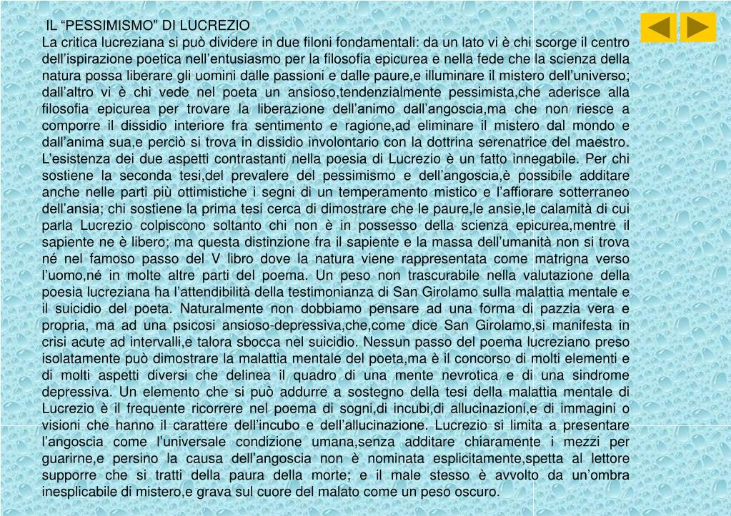 IL “PESSIMISMO” DI LUCREZIO La critica lucreziana si può dividere in due filoni fondamentali: da un lato vi è chi scorge il centro dell’ispirazione poetica nell’entusiasmo per la filosofia epicurea e nella fede che la scienza della natura possa liberare gli uomini dalle passioni e dalle paure,e illuminare il mistero dell’universo; dall’altro vi è chi vede nel poeta un ansioso,tendenzialmente pessimista,che aderisce alla filosofia epicurea per trovare la liberazione dell’animo dall’angoscia,ma che non riesce a comporre il dissidio interiore fra sentimento e ragione,ad eliminare il mistero dal mondo e dall’anima sua,e perciò si trova in dissidio involontario con la dottrina serenatrice del maestro. L’esistenza dei due aspetti contrastanti nella poesia di Lucrezio è un fatto innegabile. Per chi sostiene la seconda tesi,del prevalere del pessimismo e dell’angoscia,è possibile additare anche nelle parti più ottimistiche i segni di un temperamento mistico e l’affiorare sotterraneo dell’ansia; chi sostiene la prima tesi cerca di dimostrare che le paure,le ansie,le calamità di cui parla Lucrezio colpiscono soltanto chi non è in possesso della scienza epicurea,mentre il sapiente ne è libero; ma questa distinzione fra il sapiente e la massa dell’umanità non si trova né nel famoso passo del V libro dove la natura viene rappresentata come matrigna verso l’uomo,né in molte altre parti del poema. Un peso non trascurabile nella valutazione della poesia lucreziana ha l’attendibilità della testimonianza di San Girolamo sulla malattia mentale e il suicidio del poeta. Naturalmente non dobbiamo pensare ad una forma di pazzia vera e propria, ma ad una psicosi ansioso-depressiva,che,come dice San Girolamo,si manifesta in crisi acute ad intervalli,e talora sbocca nel suicidio. Nessun passo del poema lucreziano preso isolatamente può dimostrare la malattia mentale del poeta,ma è il concorso di molti elementi e di molti aspetti diversi che delinea il quadro di una mente nevrotica e di una sindrome depressiva. Un elemento che si può addurre a sostegno della tesi della malattia mentale di Lucrezio è il frequente ricorrere nel poema di sogni,di incubi,di allucinazioni,e di immagini o visioni che hanno il carattere dell’incubo e dell’allucinazione. Lucrezio si limita a presentare l’angoscia come l’universale condizione umana,senza additare chiaramente i mezzi per guarirne,e persino la causa dell’angoscia non è nominata esplicitamente,spetta al lettore supporre che si tratti della paura della morte; e il male stesso è avvolto da un’ombra inesplicabile di mistero,e grava sul cuore del malato come un peso oscuro.