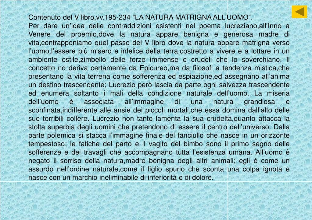 Contenuto del V libro,vv.195-234 “LA NATURA MATRIGNA ALL’UOMO”. Per dare un’idea delle contraddizioni esistenti nel poema lucreziano,all’Inno a Venere del proemio,dove la natura appare benigna e generosa madre di vita,contrapponiamo quel passo del V libro dove la natura appare matrigna verso l’uomo,l’essere più misero e infelice della terra,costretto a vivere e a lottare in un ambiente ostile,zimbello delle forze immense e crudeli che lo soverchiano. Il concetto no deriva certamente da Epicureo,ma da filosofi a tendenza mistica,che presentano la vita terrena come sofferenza ed espiazione,ed assegnano all’anima un destino trascendente; Lucrezio però lascia da parte ogni salvezza trascendente ed enumera soltanto i mali della condizione naturale dell’uomo. La miseria dell’uomo è associata all’immagine di una natura grandiosa e sconfinata,indifferente alle ansie dei piccoli mortali,che essa domina dall’alto delle sue terribili collere. Lucrezio non tanto lamenta la sua crudeltà,quanto attacca la stolta superbia degli uomini che pretendono di essere il centro dell’universo. Dalla parte polemica si stacca l’immagine finale del fanciullo che nasce in un orizzonte tempestoso; le fatiche del parto e il vagito del bimbo sono il primo segno delle sofferenze e dei travagli che accompagnano tutta l’esistenza umana. All’uomo è negato il sorriso della natura,madre benigna degli altri animali; egli è come un assurdo nell’ordine naturale,come il figlio spurio che sconta una colpa ignota e nasce con un marchio ineliminabile di inferiorità e di dolore.