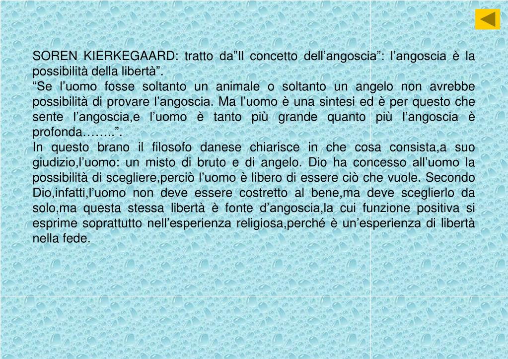 SOREN KIERKEGAARD: tratto da”Il concetto dell’angoscia”: l’angoscia è la possibilità della libertà”. “Se l’uomo fosse soltanto un animale o soltanto un angelo non avrebbe possibilità di provare l’angoscia. Ma l’uomo è una sintesi ed è per questo che sente l’angoscia,e l’uomo è tanto più grande quanto più l’angoscia è profonda……..”. In questo brano il filosofo danese chiarisce in che cosa consista,a suo giudizio,l’uomo: un misto di bruto e di angelo. Dio ha concesso all’uomo la possibilità di scegliere,perciò l’uomo è libero di essere ciò che vuole. Secondo Dio,infatti,l’uomo non deve essere costretto al bene,ma deve sceglierlo da solo,ma questa stessa libertà è fonte d’angoscia,la cui funzione positiva si esprime soprattutto nell’esperienza religiosa,perché è un’esperienza di libertà nella fede.
