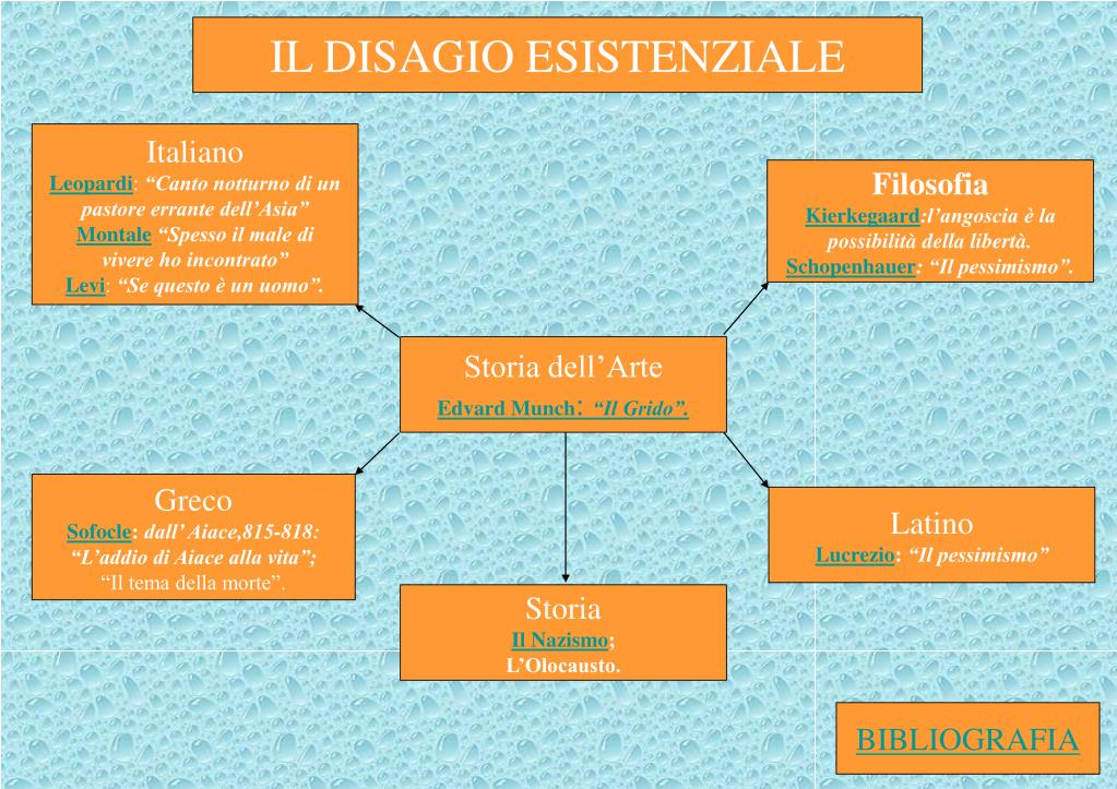 IL DISAGIO ESISTENZIALE Italiano Leopardi: “Canto notturno di un pastore errante dell’Asia” Montale“Spesso il male di vivere ho incontrato” Levi: “Se questo è un uomo”. Filosofia Kierkegaard:l’angoscia è la possibilità della libertà. Schopenhauer: “Il pessimismo”. Storia dell’Arte Edvard Munch: “Il Grido”. Greco Sofocle: dall’ Aiace,815-818: “L’addio di Aiace alla vita”; “Il tema della morte”. Latino Lucrezio:“Il pessimismo” Storia Il Nazismo; L’Olocausto. BIBLIOGRAFIA