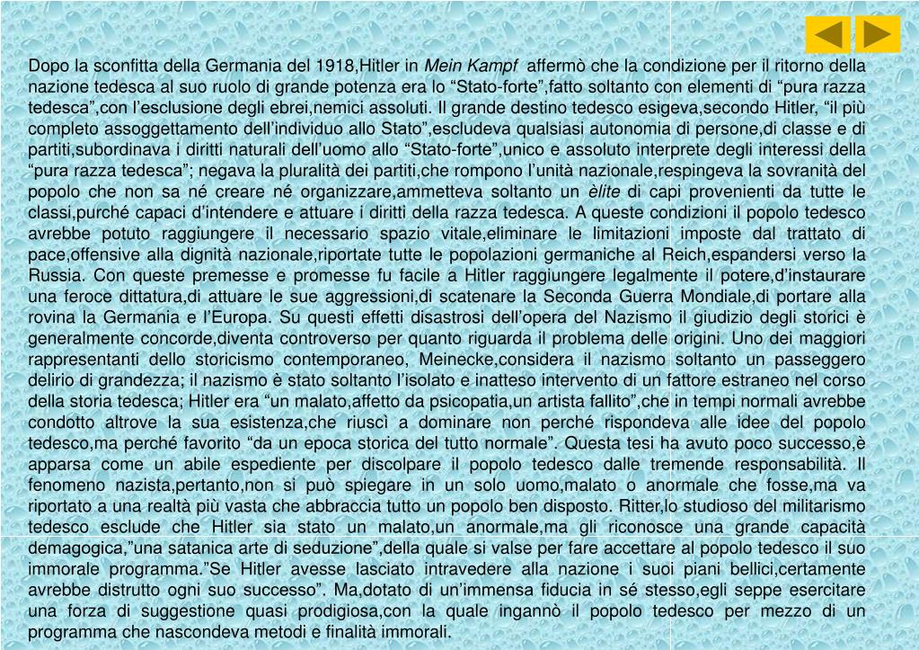 Dopo la sconfitta della Germania del 1918,Hitler in Mein Kampf affermò che la condizione per il ritorno della nazione tedesca al suo ruolo di grande potenza era lo “Stato-forte”,fatto soltanto con elementi di “pura razza tedesca”,con l’esclusione degli ebrei,nemici assoluti. Il grande destino tedesco esigeva,secondo Hitler, “il più completo assoggettamento dell’individuo allo Stato”,escludeva qualsiasi autonomia di persone,di classe e di partiti,subordinava i diritti naturali dell’uomo allo “Stato-forte”,unico e assoluto interprete degli interessi della “pura razza tedesca”; negava la pluralità dei partiti,che rompono l’unità nazionale,respingeva la sovranità del popolo che non sa né creare né organizzare,ammetteva soltanto un èlite di capi provenienti da tutte le classi,purché capaci d’intendere e attuare i diritti della razza tedesca. A queste condizioni il popolo tedesco avrebbe potuto raggiungere il necessario spazio vitale,eliminare le limitazioni imposte dal trattato di pace,offensive alla dignità nazionale,riportate tutte le popolazioni germaniche al Reich,espandersi verso la Russia. Con queste premesse e promesse fu facile a Hitler raggiungere legalmente il potere,d’instaurare una feroce dittatura,di attuare le sue aggressioni,di scatenare la Seconda Guerra Mondiale,di portare alla rovina la Germania e l’Europa. Su questi effetti disastrosi dell’opera del Nazismo il giudizio degli storici è generalmente concorde,diventa controverso per quanto riguarda il problema delle origini. Uno dei maggiori rappresentanti dello storicismo contemporaneo, Meinecke,considera il nazismo soltanto un passeggero delirio di grandezza; il nazismo è stato soltanto l’isolato e inatteso intervento di un fattore estraneo nel corso della storia tedesca; Hitler era “un malato,affetto da psicopatia,un artista fallito”,che in tempi normali avrebbe condotto altrove la sua esistenza,che riuscì a dominare non perché rispondeva alle idee del popolo tedesco,ma perché favorito “da un epoca storica del tutto normale”. Questa tesi ha avuto poco successo,è apparsa come un abile espediente per discolpare il popolo tedesco dalle tremende responsabilità. Il fenomeno nazista,pertanto,non si può spiegare in un solo uomo,malato o anormale che fosse,ma va riportato a una realtà più vasta che abbraccia tutto un popolo ben disposto. Ritter,lo studioso del militarismo tedesco esclude che Hitler sia stato un malato,un anormale,ma gli riconosce una grande capacità demagogica,”una satanica arte di seduzione”,della quale si valse per fare accettare al popolo tedesco il suo immorale programma.”Se Hitler avesse lasciato intravedere alla nazione i suoi piani bellici,certamente avrebbe distrutto ogni suo successo”. Ma,dotato di un’immensa fiducia in sé stesso,egli seppe esercitare una forza di suggestione quasi prodigiosa,con la quale ingannò il popolo tedesco per mezzo di un programma che nascondeva metodi e finalità immorali.