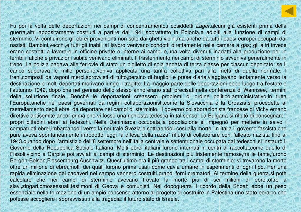 Fu poi la volta delle deportazioni nei campi di concentramento,i cosiddetti Lager,alcuni già esistenti prima della guerra,altri appositamente costruiti a partire dal 1941,soprattutto in Polonia,e adibiti alla funzione di campi di sterminio. Vi confluirono gli ebrei provenienti non solo dai ghetti vicini,ma anche da tutti i paesi europei occupati dai nazisti. Bambini,vecchi,e tutti gli inabili al lavoro venivano condotti direttamente nelle camere a gas; gli altri invece erano costretti a lavorare in officine private o interne ai campi e,una volta divenuti inadatti alla produzione per le terribili fatiche e privazioni subite venivano eliminati. Il trasferimento nei campi di sterminio avveniva generalmente in treno. La polizia pagava alle ferrovie di stato un biglietto di sola andata di terza classe per ciascun deportato: se il carico superava le mille persone,veniva applicata una tariffa collettiva pari alla metà di quella normale. I treni,composti da vagoni merci,sprovvisti di tutto,persino di buglioli e prese d’aria,viaggiavano lentamente verso la destinazione,e molti deportati morivano lungo il tragitto. La maggio parte delle deportazioni ebbe luogo tra l’estate e l’autunno 1942, dopo che nel gennaio dello stesso anno erano stati precisati,nella conferenza di Wannsee,i termini della soluzione finale. Benché le deportazioni creassero problemi di ordine politico,amministrativo,in tutta l’Europa,anche nei paesi governati da regimi collaborazionisti,come la Slovacchia e la Croazia,si procedette al rastrellamento degli ebrei da deportare nei campi di sterminio. Il governo collaborazionista francese di Vichy emanò direttive antisemite ancor prima che vi fosse una richiesta tedesca in tal senso. La Bulgaria si rifiutò di consegnare i propri cittadini ebrei ai tedeschi. Nella Danimarca occupata,la popolazione si impegnò per mettere in salvo i compatrioti ebrei,imbarcandoli verso la neutrale Svezia e sottraendoli così alla morte. In Italia il governo fascista,che pure aveva spontaneamente introdotto leggi “a difesa della razza” rifiutò di collaborare con l’alleato nazista fino al 1943,quando dopo l’armistizio dell’8 settembre nell’Italia centrale e settentrionale occupata dai tedeschi,si instaurò il Governo della Repubblica Sociale Italiana. Molti ebrei italiani furono internati in centri di raccolta,come quello di Fissoli,vicino a Carpi,e poi avviati ai campi di sterminio. Le destinazioni più tristemente famose,fra le tante,furono Bergen-Belsen,Flossemburg,Auschwitz. Quest’ultimo era il più grande tra i campi di sterminio; vi trovarono la morte oltre un milione di ebrei,molti dei quali furono prima usati come cavia umane in esperimenti di ogni tipo. Per una rapida eliminazione dei cadaveri nel campo vennero costruiti grandi forni crematori. Al termine della guerra,si potè calcolare che nei campi di sterminio avevano trovato la morte più di sei milioni di ebrei,oltre a slavi,zingari,omosessuali,testimoni di Geova e comunisti. Nel dopoguerra il ricordo della Shoah ebbe un peso essenziale nella formazione di un ampio consenso attorno al progetto di costruire in Palestina uno stato ebraico che potesse accogliere i sopravvissuti alla tragedia: il futuro stato di Israele.