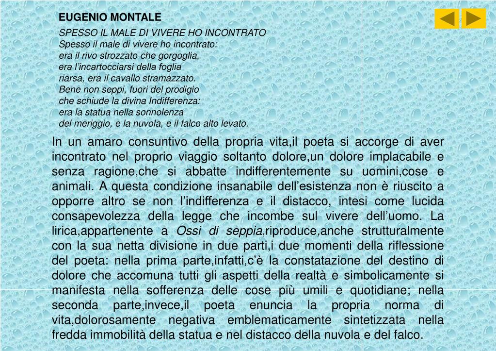 EUGENIO MONTALE SPESSO IL MALE DI VIVERE HO INCONTRATO Spesso il male di vivere ho incontrato: era il rivo strozzato che gorgoglia, era l’incartocciarsi della foglia riarsa, era il cavallo stramazzato. Bene non seppi, fuori del prodigio che schiude la divina Indifferenza: era la statua nella sonnolenza del meriggio, e la nuvola, e il falco alto levato. In un amaro consuntivo della propria vita,il poeta si accorge di aver incontrato nelproprio viaggio soltanto dolore,un dolore implacabile e senza ragione,che si abbatte indifferentemente su uomini,cose e animali. A questa condizione insanabile dell’esistenza non è riuscito a opporre altro se non l’indifferenza e il distacco, intesi come lucida consapevolezza della legge che incombe sul vivere dell’uomo. Lalirica,appartenente a Ossi di seppia,riproduce,anche strutturalmente con la sua netta divisione in due parti,i due momenti della riflessione del poeta: nella prima parte,infatti,c’è la constatazione del destino di dolore che accomuna tutti gli aspetti della realtà e simbolicamente si manifesta nella sofferenza delle cose più umili e quotidiane; nella seconda parte,invece,il poeta enuncia la propria norma di vita,dolorosamente negativa emblematicamente sintetizzata nella fredda immobilità della statua e nel distacco della nuvola e del falco.
