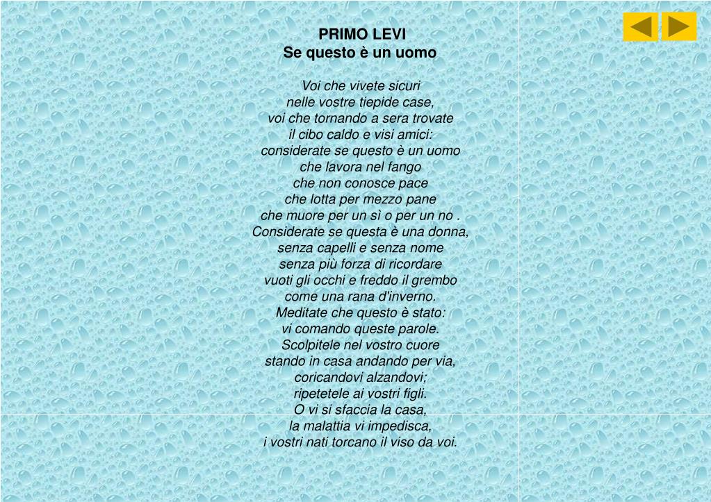 PRIMO LEVI Se questo è un uomo Voi che vivete sicuri nelle vostre tiepide case, voi che tornando a sera trovate il cibo caldo e visi amici: considerate se questo è un uomo che lavora nel fango che non conosce pace che lotta per mezzo pane che muore per un sì o per un no . Considerate se questa è una donna, senza capelli e senza nome senza più forza di ricordare vuoti gli occhi e freddo il grembo come una rana d'inverno. Meditate che questo è stato: vi comando queste parole. Scolpitele nel vostro cuore stando in casa andando per via, coricandovi alzandovi; ripetetele ai vostri figli. O vi si sfaccia la casa, la malattia vi impedisca, i vostri nati torcano il viso da voi.