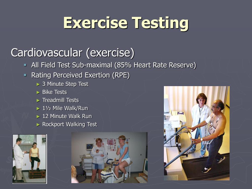 Exercise Testing Cardiovascular (exercise) • All Field Test Sub-maximal (85% Heart Rate Reserve) • Rating Perceived Exertion (RPE) • 3 Minute Step Test • Bike Tests • Treadmill Tests • 1½ Mile Walk/Run • 12 Minute Walk Run • Rockport Walking Test