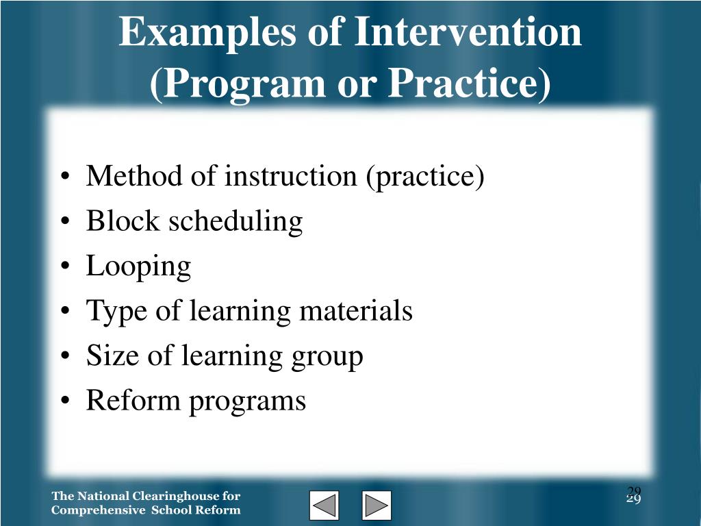 Examples of Intervention (Program or Practice) • Method of instruction (practice) • Block scheduling • Looping • Type of learning materials • Size of learning group • Reform programs