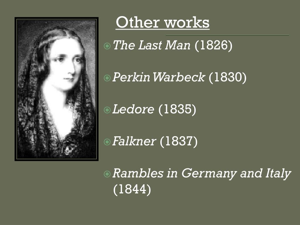 Other works • The Last Man(1826) • Perkin Warbeck (1830) • Ledore(1835) • Falkner(1837) • Rambles in Germany and Italy (1844)