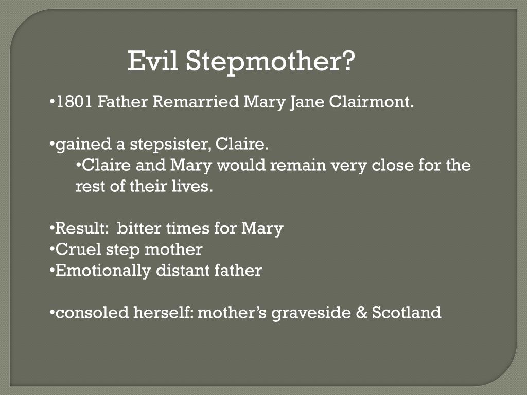 Evil Stepmother? • 1801 Father Remarried Mary Jane Clairmont. • gained a stepsister, Claire. • Claire and Mary would remain very close for the rest of their lives. • Result: bitter times for Mary • Cruel step mother • Emotionally distant father • consoled herself: mother’s graveside & Scotland