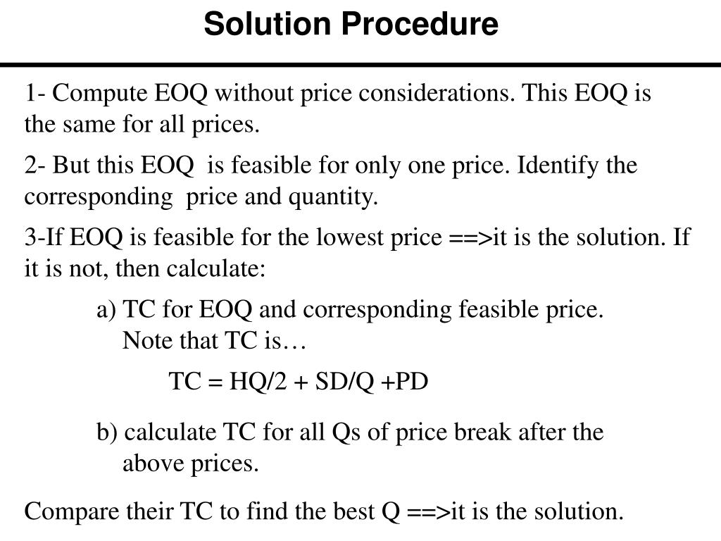 Solution Procedure 1- Compute EOQ without price considerations. This EOQ is the same for all prices. 2- But this EOQ is feasible for only one price. Identify the corresponding price and quantity. 3-If EOQ is feasible for the lowest price ==>it is the solution. If it is not, then calculate: a) TC for EOQ and corresponding feasible price. Note that TC is… TC = HQ/2 + SD/Q +PD b) calculate TC for all Qs of price break after the above prices. Compare their TC to find the best Q ==>it is the solution.