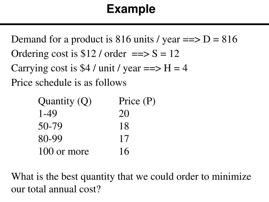 Example Demand for a product is 816 units / year ==> D = 816 Ordering cost is $12 / order ==> S = 12 Carrying cost is $4 / unit / year ==> H = 4 Price schedule is as follows Quantity (Q) Price (P) 1-49 20 50-79 18 80-99 17 100 or more 16 What is the best quantity that we could order to minimize our total annual cost?