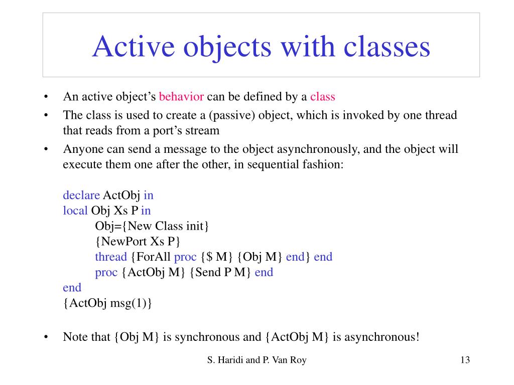 Active objects with classes • An active object’s behavior can be defined by a class • The class is used to create a (passive) object, which is invoked by one thread that reads from a port’s stream • Anyone can send a message to the object asynchronously, and the object will execute them one after the other, in sequential fashion:declare ActObj inlocal Obj Xs P in Obj={New Class init} {NewPort Xs P}thread {ForAll proc {$ M} {Obj M} end} endproc {ActObj M} {Send P M} endend{ActObj msg(1)} • Note that {Obj M} is synchronous and {ActObj M} is asynchronous! S. Haridi and P. Van Roy