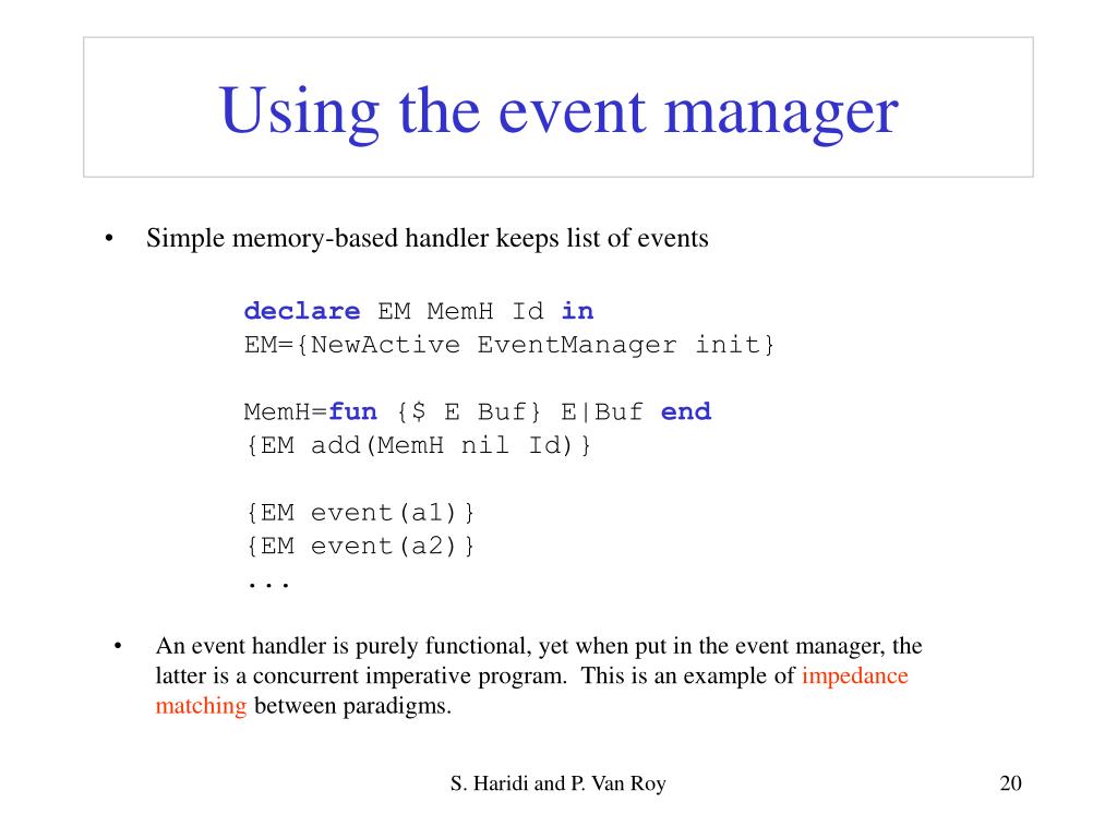 Using the event manager • Simple memory-based handler keeps list of events declare EM MemH Id in EM={NewActive EventManager init} MemH=fun {$ E Buf} E|Buf end {EM add(MemH nil Id)} {EM event(a1)} {EM event(a2)} ... • An event handler is purely functional, yet when put in the event manager, the latter is a concurrent imperative program. This is an example of impedance matching between paradigms. S. Haridi and P. Van Roy