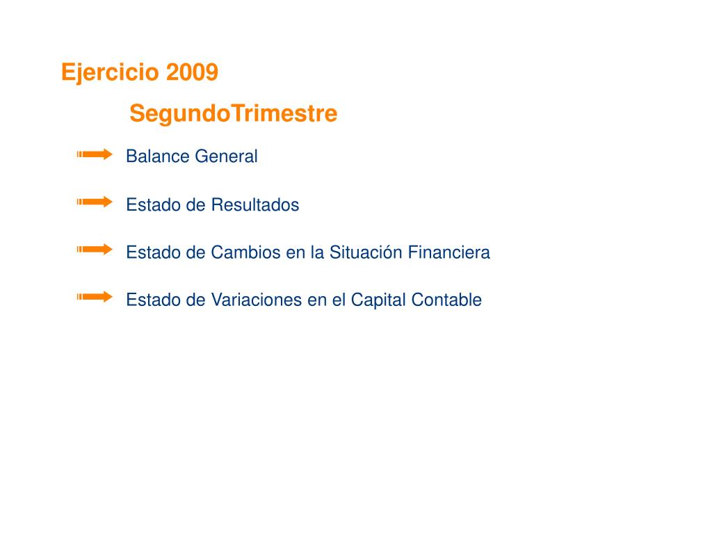 Ejercicio 2009 SegundoTrimestre Balance General Estado de Resultados Estado de Cambios en la Situación Financiera Estado de Variaciones en el Capital Contable