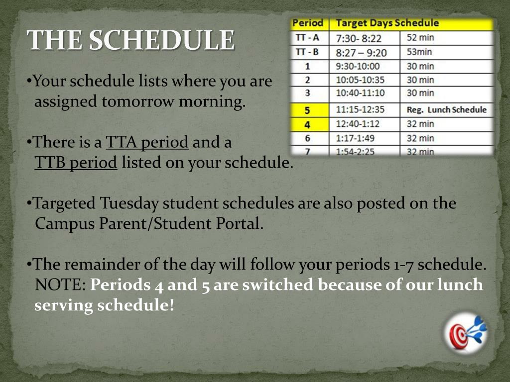 THE SCHEDULE • Your schedule lists where you are • assigned tomorrow morning. • There is a TTA period and a TTB period listed on your schedule. • Targeted Tuesday student schedules are also posted on the • Campus Parent/Student Portal. • The remainder of the day will follow your periods 1-7 schedule. • NOTE: Periods 4 and 5 are switched because of our lunch • serving schedule!