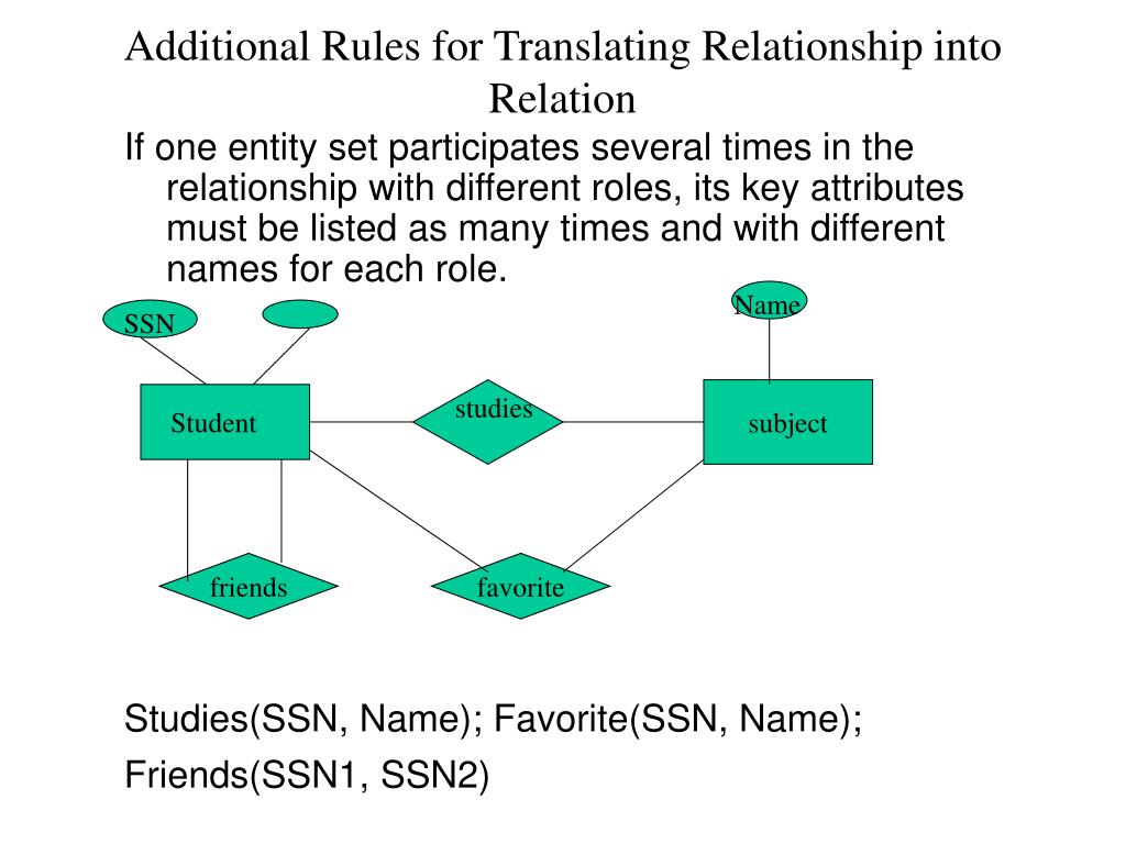 Additional Rules for Translating Relationship into Relation If one entity set participates several times in the relationship with different roles, its key attributes must be listed as many times and with different names for each role. Studies(SSN, Name); Favorite(SSN, Name); Friends(SSN1, SSN2) Name SSN subject studies Student friends favorite