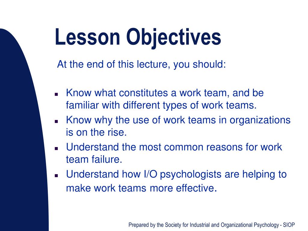 Industrial-Organizational Psychology Learning Module Work Teams. Prepared by the Society for Industrial and Organizational Psychology - SIOP. Lesson Objectives. At the end of this lecture, you should:. Know what constitutes a work team, and be familiar with different types of work teams.