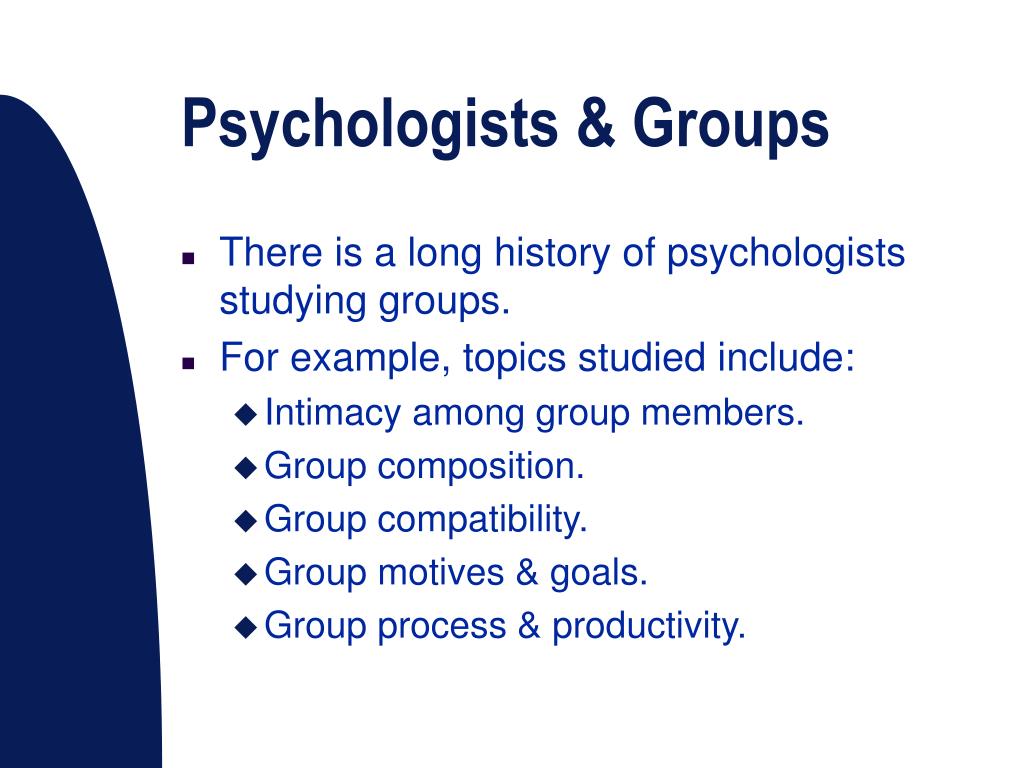 Psychologists & Groups • There is a long history of psychologists studying groups. • For example, topics studied include: • Intimacy among group members. • Group composition. • Group compatibility. • Group motives & goals. • Group process & productivity.