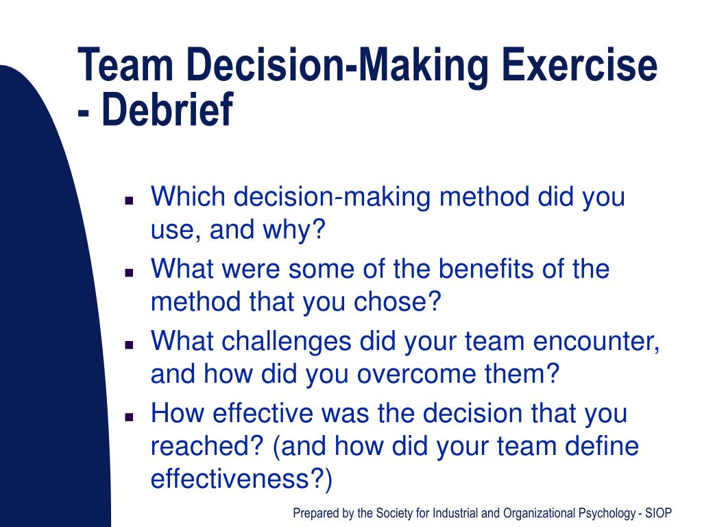 Team Decision-Making Exercise - Debrief • Which decision-making method did you use, and why? • What were some of the benefits of the method that you chose? • What challenges did your team encounter, and how did you overcome them? • How effective was the decision that you reached? (and how did your team define effectiveness?) Prepared by the Society for Industrial and Organizational Psychology - SIOP