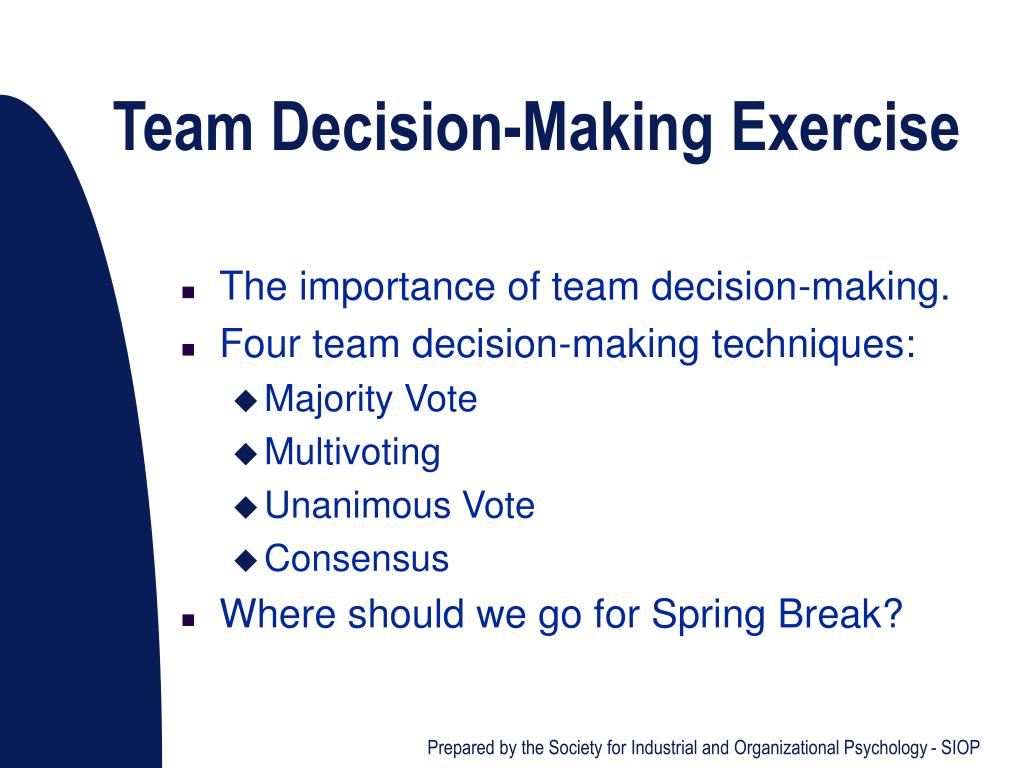 Team Decision-Making Exercise • The importance of team decision-making. • Four team decision-making techniques: • Majority Vote • Multivoting • Unanimous Vote • Consensus • Where should we go for Spring Break? Prepared by the Society for Industrial and Organizational Psychology - SIOP