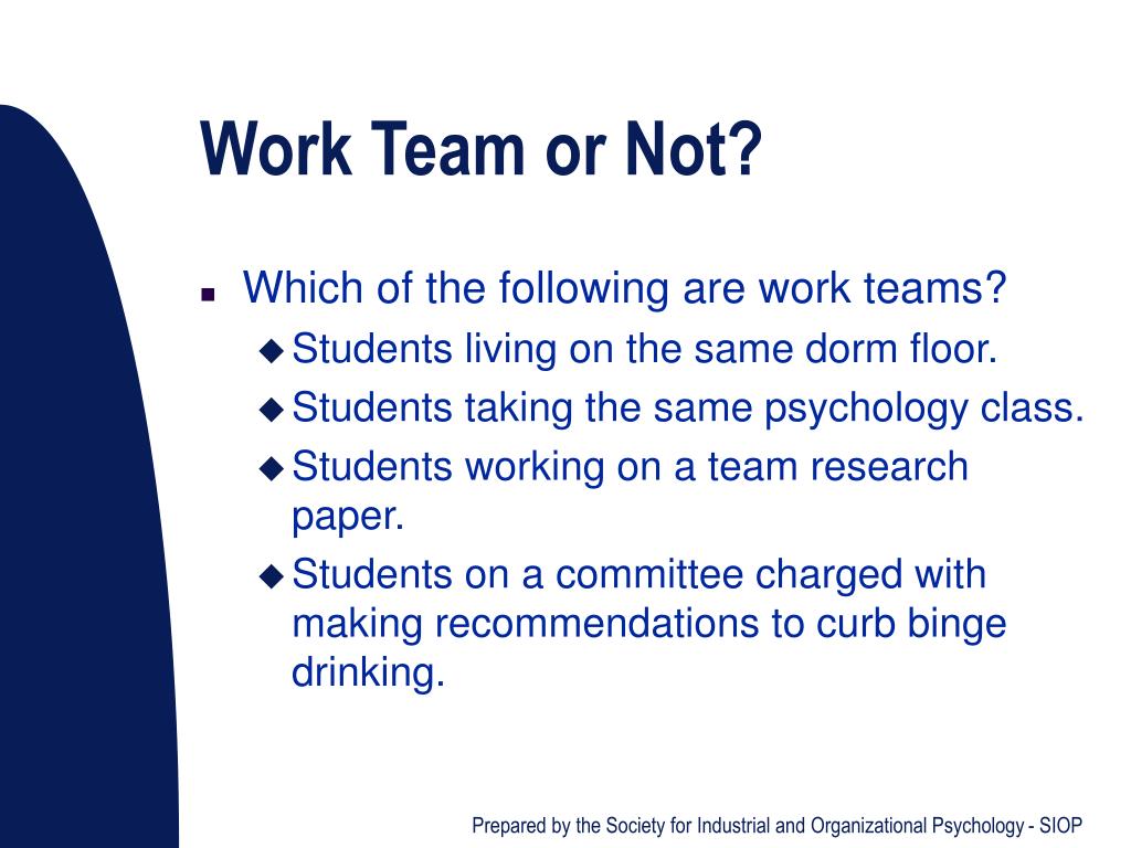 Work Team or Not? • Which of the following are work teams? • Students living on the same dorm floor. • Students taking the same psychology class. • Students working on a team research paper. • Students on a committee charged with making recommendations to curb binge drinking. Prepared by the Society for Industrial and Organizational Psychology - SIOP
