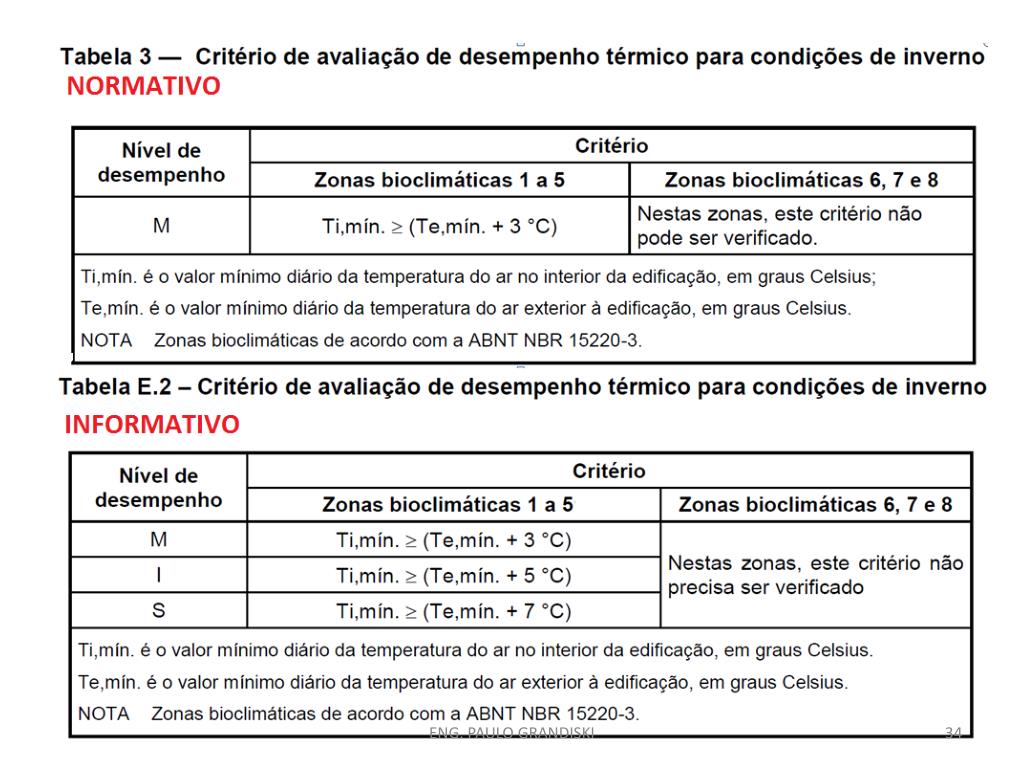 Requisitos no inverno • 11.4 Requisitos de desempenho no inverno • Apresentar condições térmicas no interior do edifício habitacional melhores que do ambiente externo, no dia típico de inverno, conforme 11.4.1, nas zonas bioclimáticas 1 a 5. Nas zonas 6, 7 e 8 não é necessário realizar avaliação de desempenho térmico para inverno. • 11.4.1 Critério – Valores mínimos de temperatura • Os valores mínimos diários da temperatura do ar interior de recintos de permanência prolongada, tais como, salas e dormitórios, no dia típico de inverno, devem ser sempre maiores ou iguais à temperatura mínima externa acrescida de 3 °C. ENG. PAULO GRANDISKI