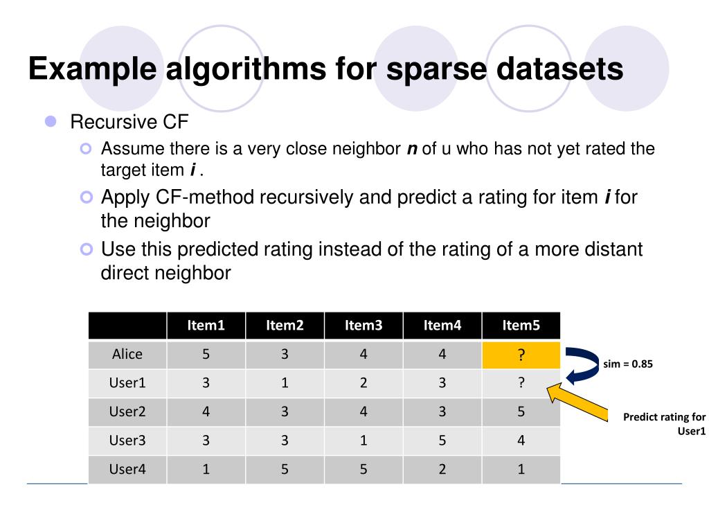 Example algorithms for sparse datasets • Recursive CF • Assume there is a very close neighbor n of u who has not yet rated the target item i. • Apply CF-method recursively and predict a rating for item i for the neighbor • Use this predicted rating instead of the rating of a more distant direct neighbor sim = 0.85 Predict rating for User1