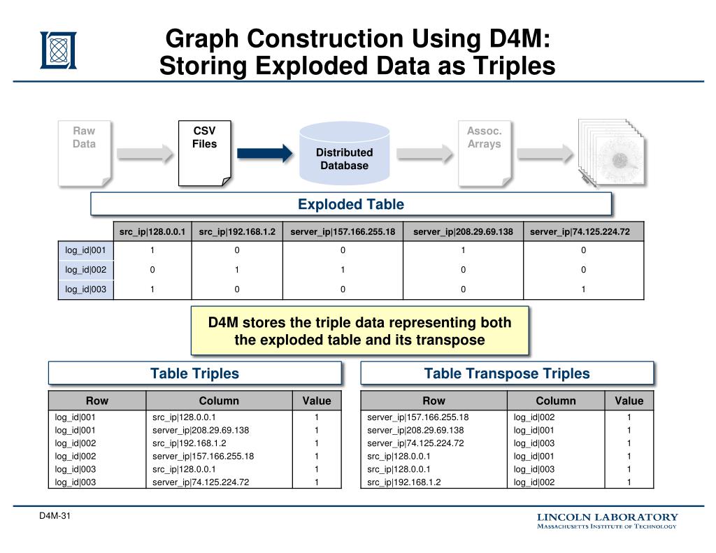 Graph Construction Using D4M:Storing Exploded Data as Triples Raw Data CSV Files Distributed Database Assoc.Arrays Exploded Table D4M stores the triple data representing both the exploded table and its transpose Table Triples Table Transpose Triples